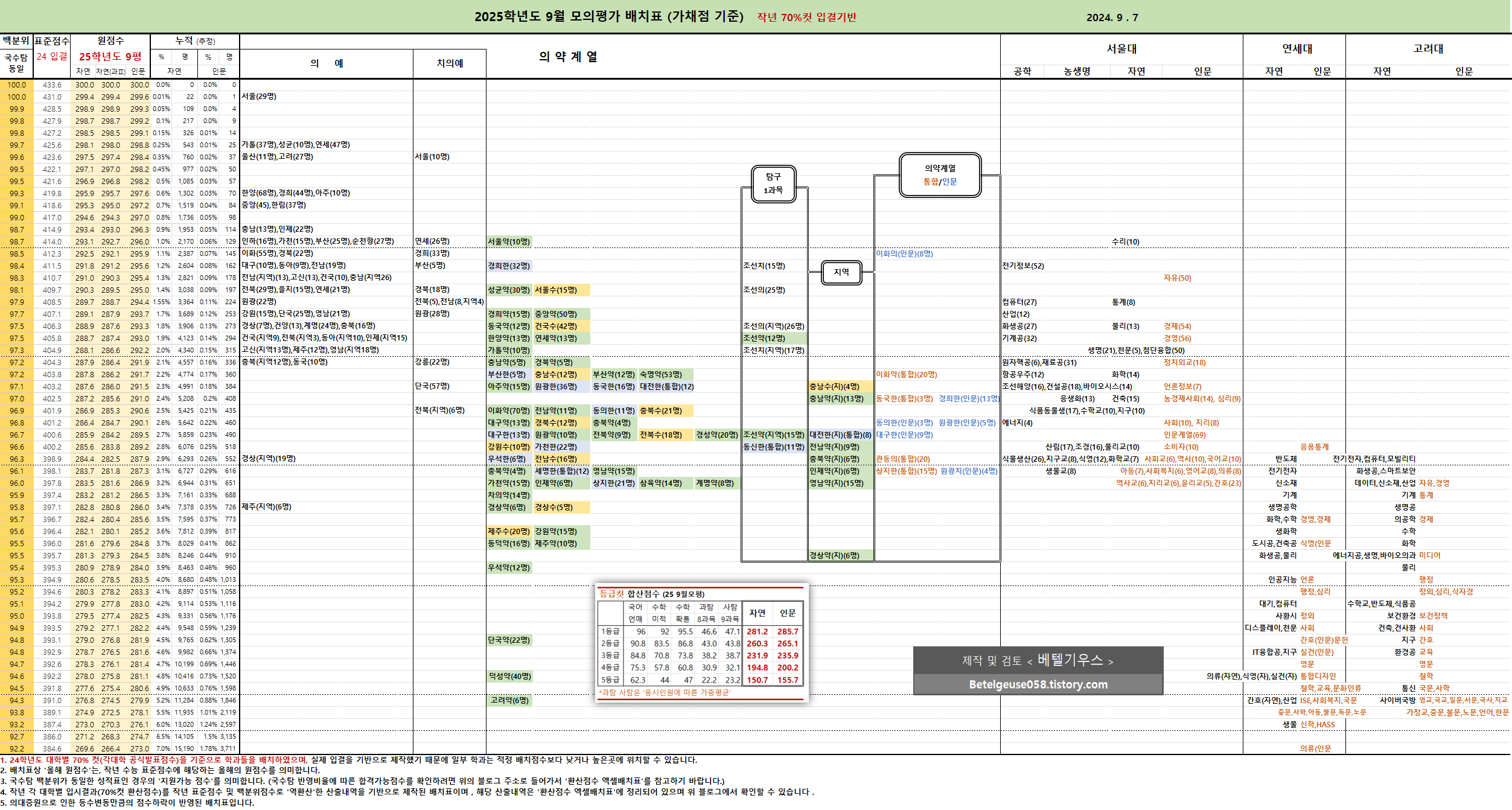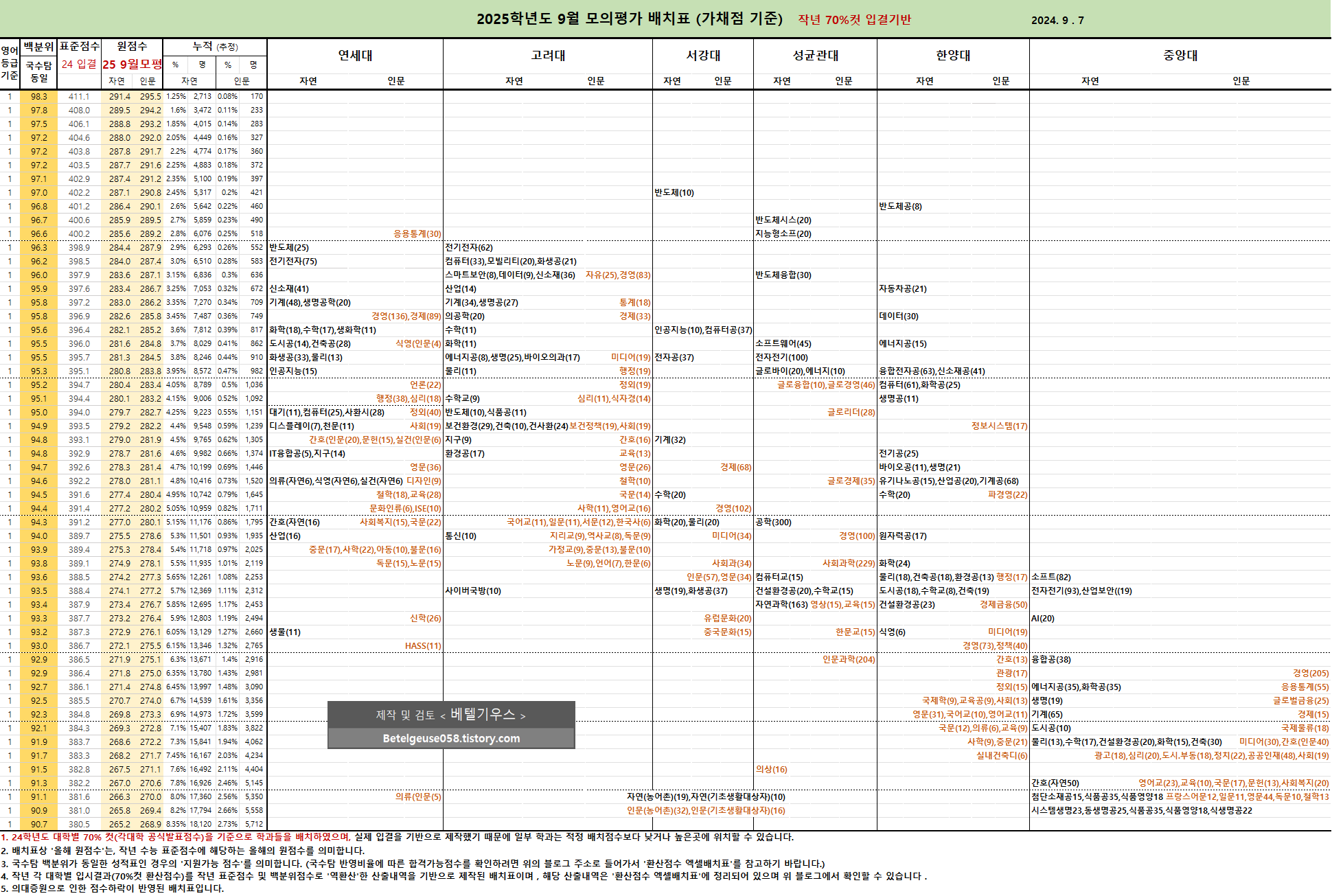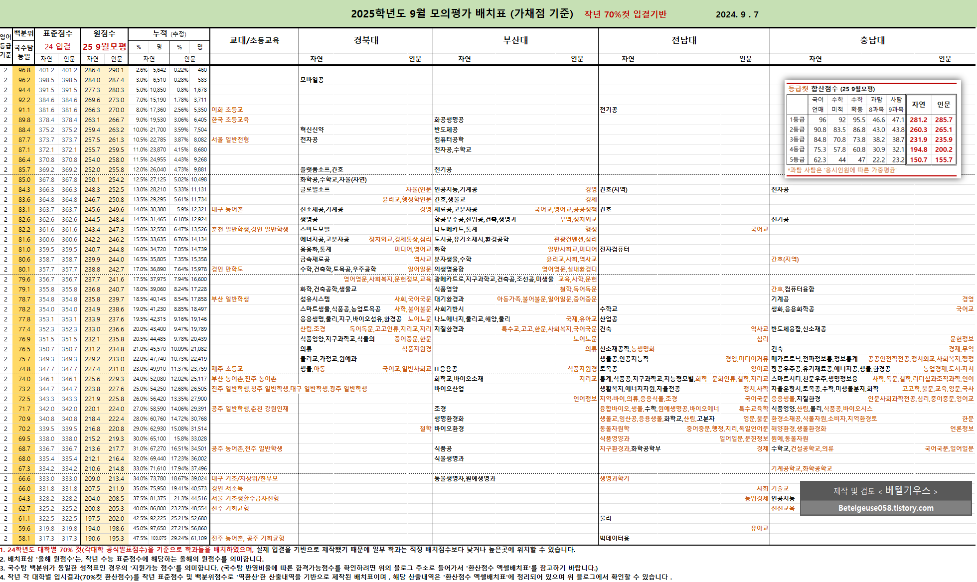 2025학년도 9월 모평 가채점 배치표입니다 (원점수)