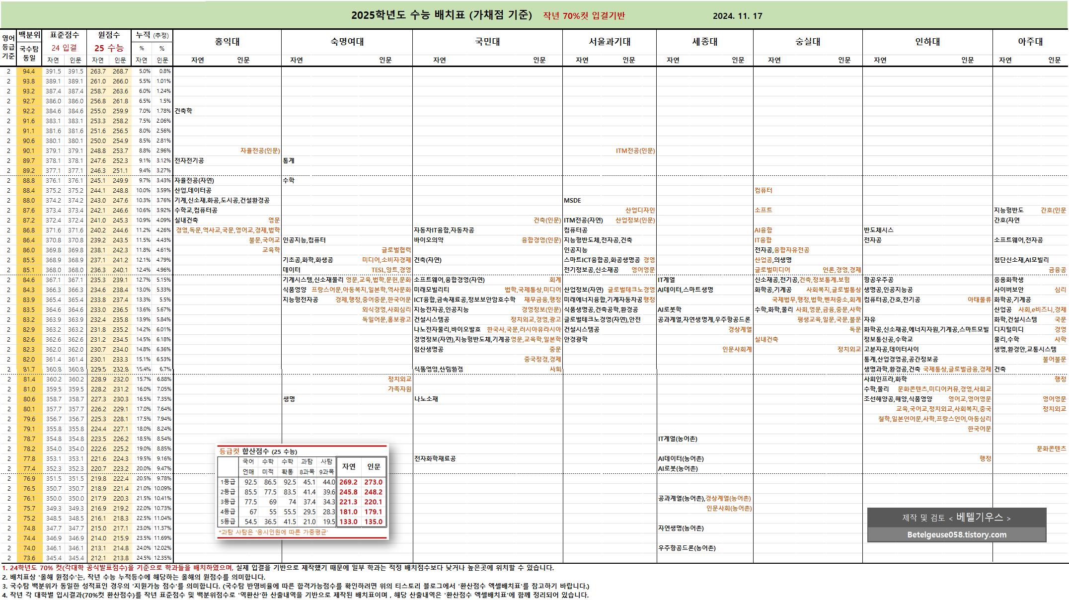 배치표의 점수는 각 과목의 백분위가 동일한 경우에 지원가능한 점수(원점수 및 백분위점수)를 의미합니다.
