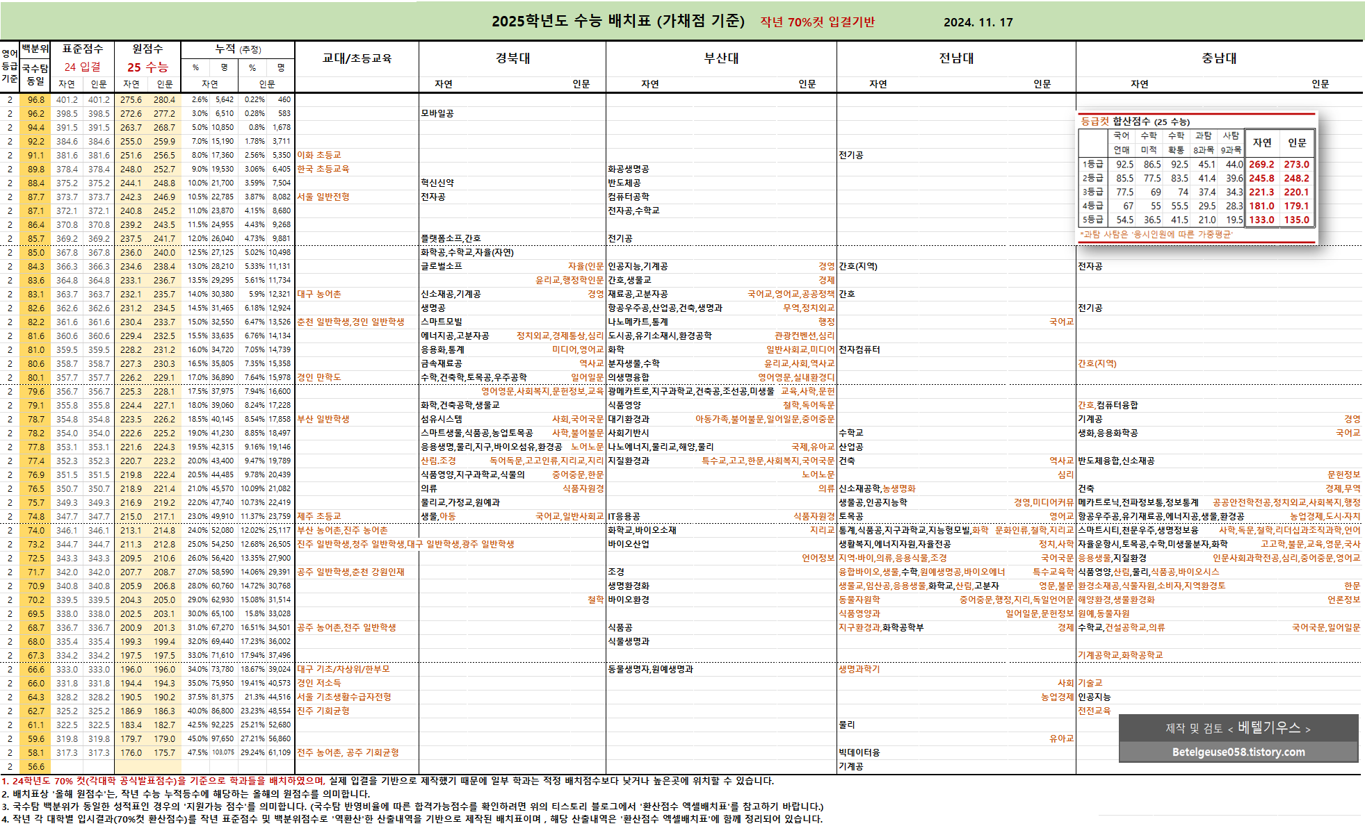 2025학년도 수능 가채점 배치표입니다 (원점수 기준)