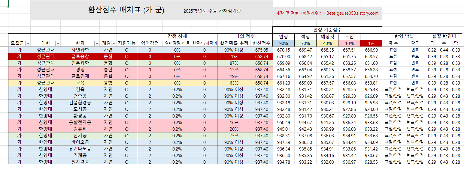 해당 엑셀배치표에는, 42개대학 2천여개 학과의 작년 실제 입시결과(각 대학에서 발표한 대학별 환산점수)를